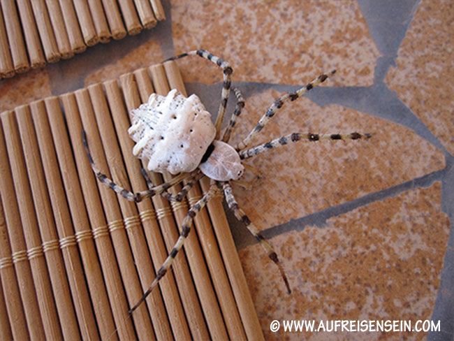 Die Weibchen können eine Körpergröße von bis zu 25mm erreichen und ähneln vom Aussehen her einer weißen bis gelben Muscheloberseite. Die langen acht Beine sind auffällig schwarz gelb geringelt.
