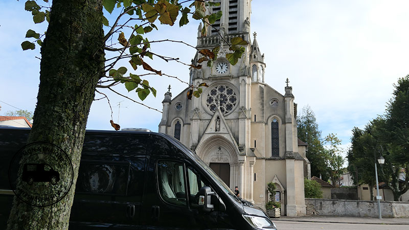 Kastenwagen vor der Eglise de la Tres Sainte Trinite